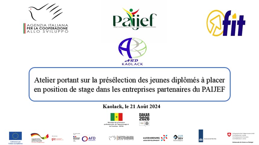 Dans le cadre de la mise en œuvre du Projet d’Appui à l’Insertion des Jeunes et des Femmes Formés (PAIJEF), l’Agence Régionale de Développement (ARD) de Kaolack a organisé, le mercredi 21 août, un Atelier portant sur la présélection des jeunes diplômés à placer en position de stage dans les entreprises partenaires du PAIJEF, suite à l’appel à candidature ouvert du 1er au 12 août. Cet atelier a réuni les principaux acteurs institutionnels de l’emploi dans la région de Kaolack.